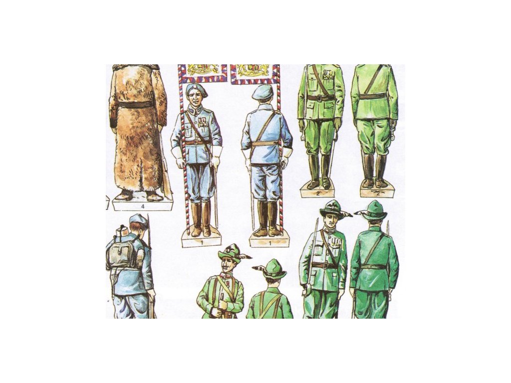 hradní stráž - nosič prezidentské standarty (1930), hradní stráž - ruský legionář (1930), hradní stráž - italský legionář (1930), ruský legionář (Sibiř, -40°C), ruský legionář (Ukrajina, 1917), francouzský legionář (Francie, 1918), francouzský legionář (zima 1917), italský legionář (Itálie 1918), italský legionář - poddůstojník (1918)