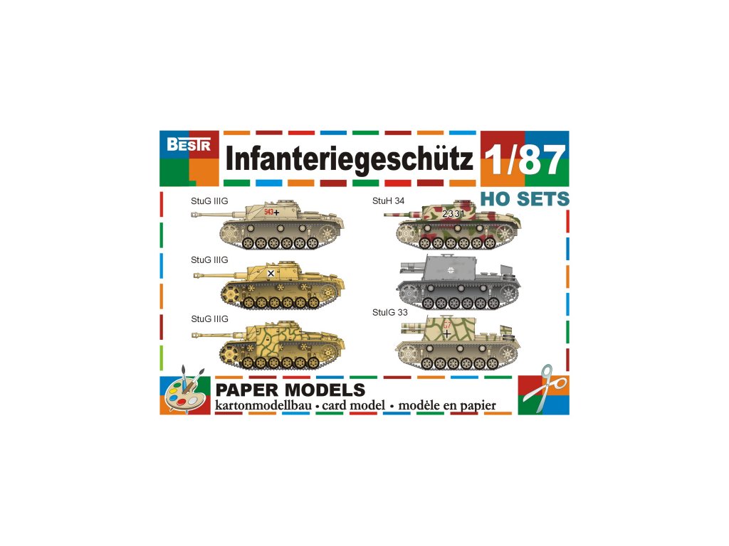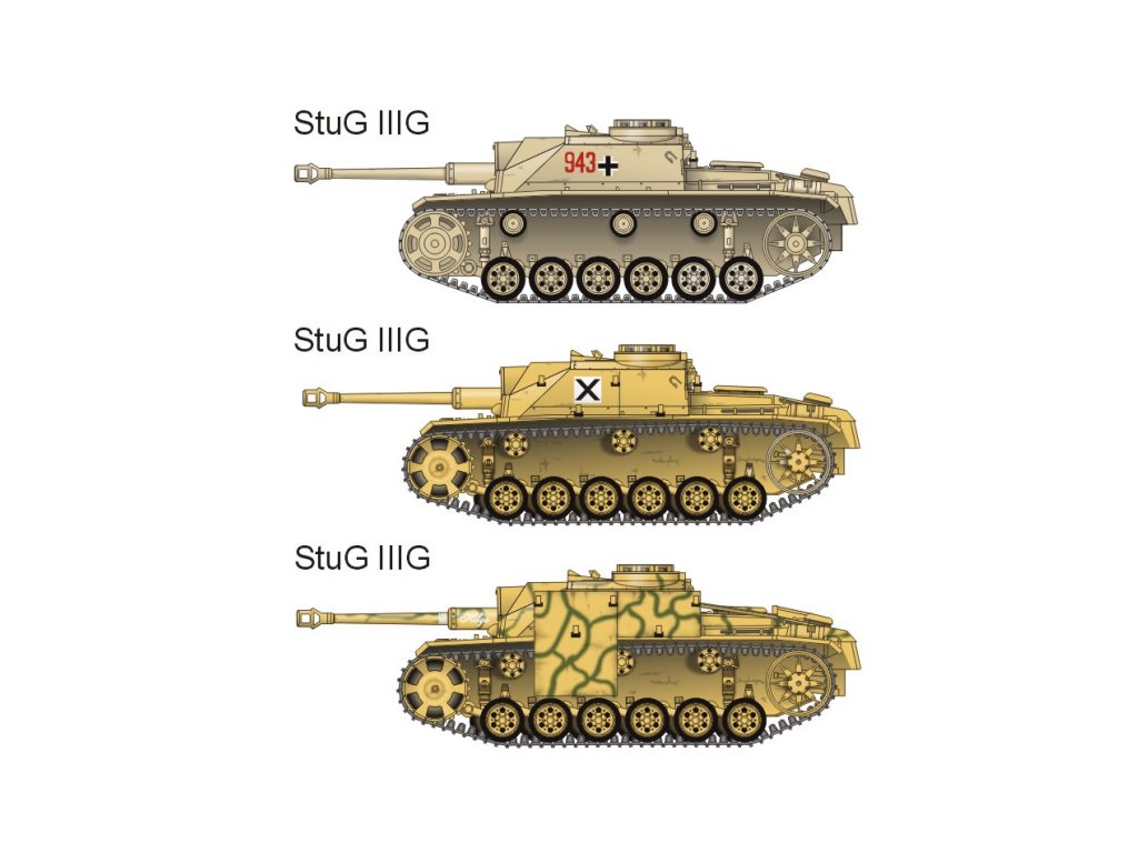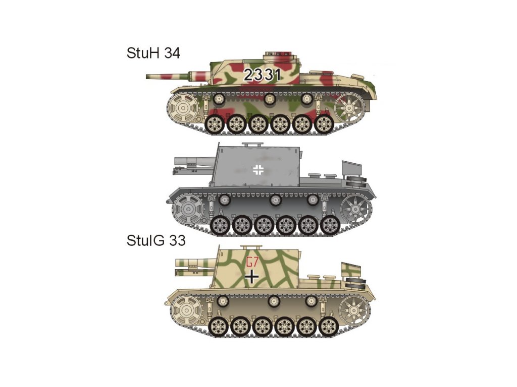 StuG III G (3 různé verze), StuH 34 (2 různé verze), StuG 33