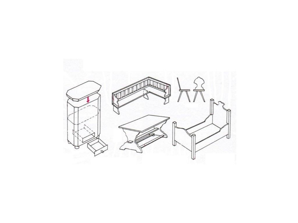 vybavení staré venkovské světnice: malovaná skříň a truhla, postel, židle, stůl