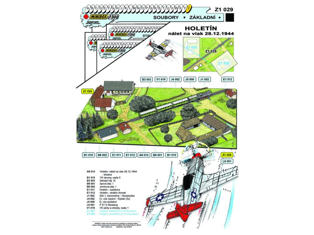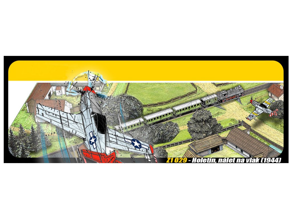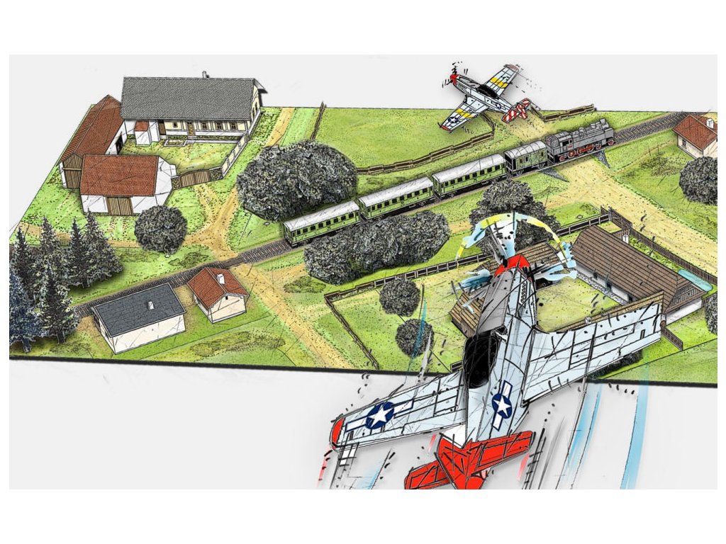 Sada obsahuje: terén, zastávku a strážní domek, parní lokomotivu, 3 osobní a 1 služební vagon, stromy, americkou stíhačku, stromy a ploty.