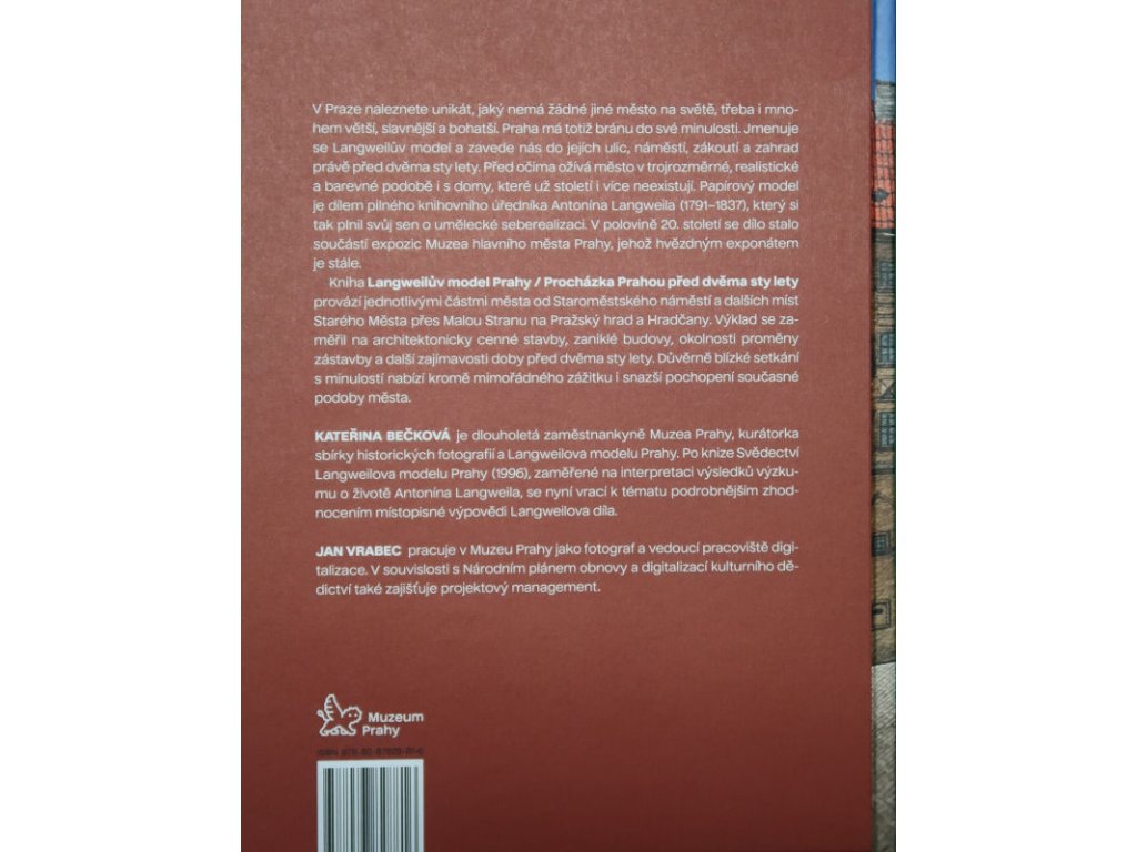 V Praze naleznete unikát, jaký nemá žádné jiné město na světě. Praha má totiž bránu do své minulosti. Jmenuje se Langweilův model a zavede nás do jejích ulic, náměstí, zákoutí a zahrad právě před dvěma sty lety. Před očima ožívá město v trojrozměrné, realistické a barevné podobě i s domy, které už století i více neexistují. Papírový model je dílem knihovního úředníka Antonína Langweila (1791–1837), který si tak plnil svůj sen o umělecké seberealizaci. V polovině 20. století se dílo stalo součástí expozic Muzea hlavního města Prahy, jehož hvězdným exponátem je dosud. Kniha Langweilův model Prahy / Procházka Prahou před dvěma sty lety provází jednotlivými částmi města od Staroměstského náměstí a dalších míst Starého Města přes Malou Stranu na Pražský hrad a Hradčany. Výklad se zaměřil na architektonicky cenné stavby, zaniklé budovy, okolnosti proměny zástavby a další zajímavosti doby před dvěma sty lety. Důvěrně blízké setkání s minulostí nabízí kromě mimořádného zážitku i snazší pochopení současné podoby města.