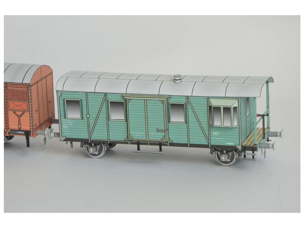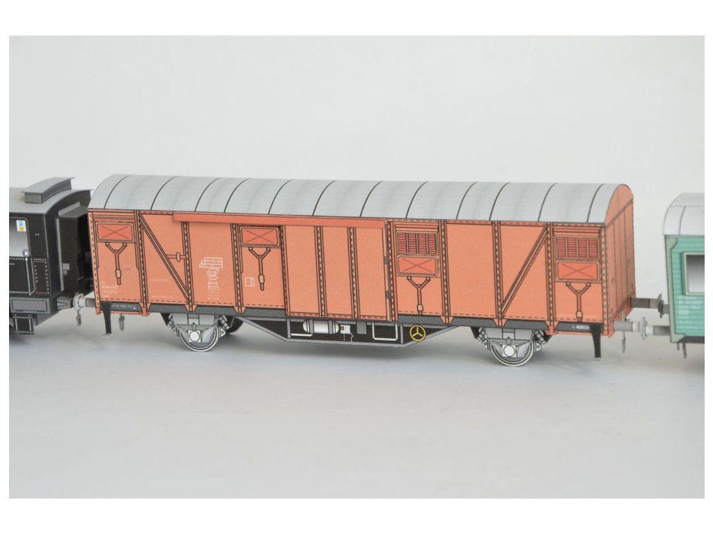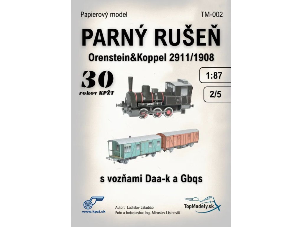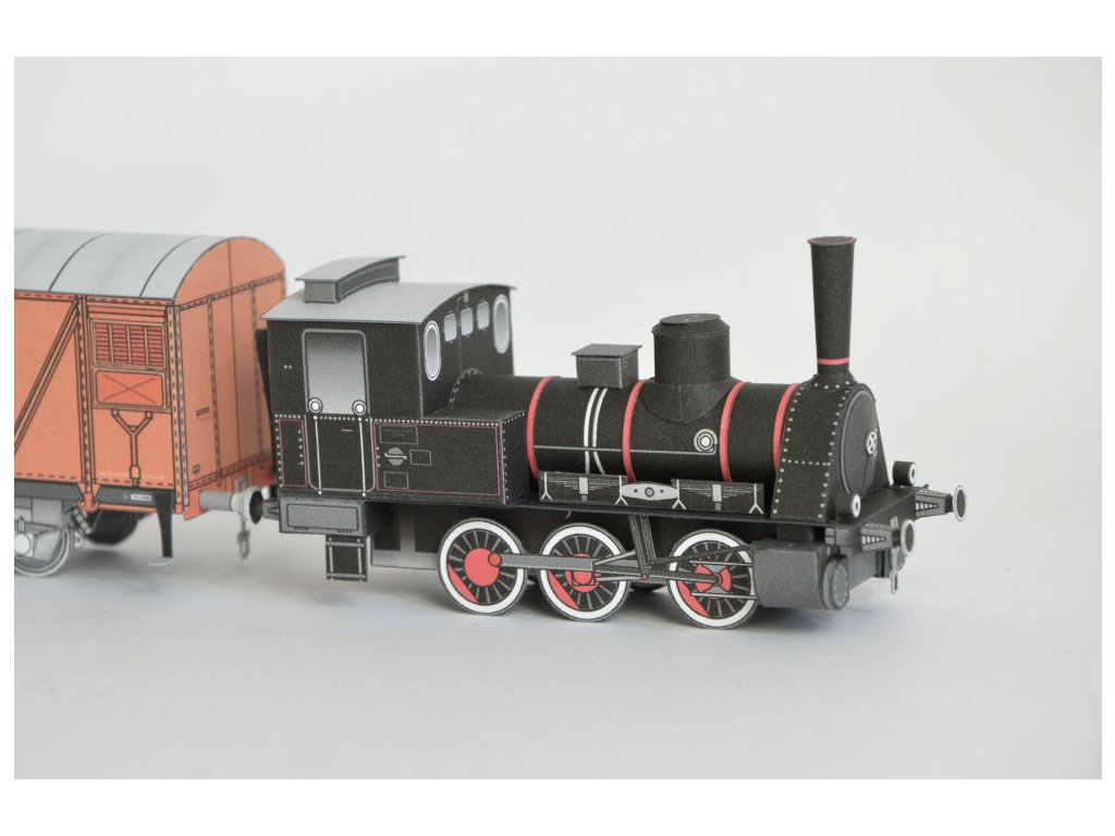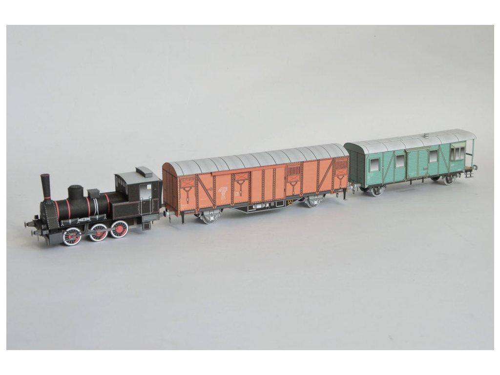 rakouská parní lokomotiva (Orenstein&Koppel - 1908) + služební vagón (Vagónka TATRA Česká Lípa) + krytý dvounápravový nákladní vůz (Vagónka TATRA Česká Lípa)