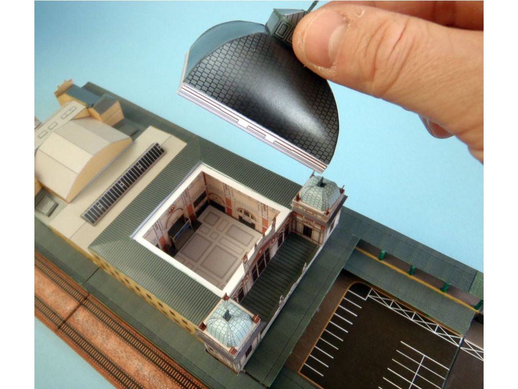 včetně interiéru odbavovací haly (odklopná střecha budovy) se sochami hutníka a železničáře, včetně železničních vozidel