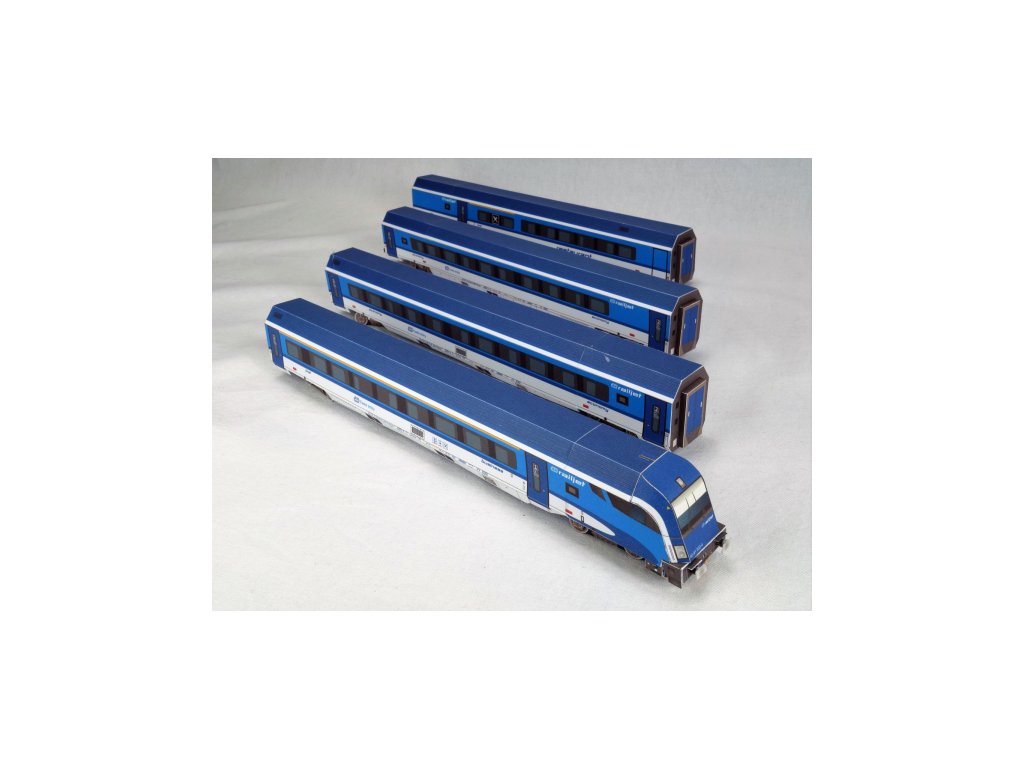 jednotka Railjet společnosti ČD (České dráhy): lokomotiva Taurus ř. 1216 + 2x vagón třídy Economy + vagón Restaurant + řídící vůz